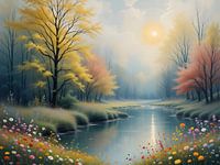 Een schilderachtige rivier die zachtjes door een herfstlandschap stroomt.