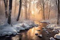 Een beekje stroomt door een besneeuwd bos met een zonsondergang op de achtergrond.