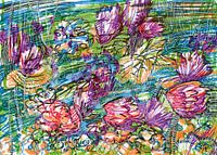 Kleurrijke tekening met inkt van bloemen in een rivier in de natuur.