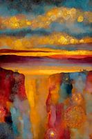 Een kloof opent zich tussen twee rotswanden in diepe tinten rood en blauw. Vanuit de horizon stroomt een gouden gloed de diepte in, als een rivier van licht die de kliffen met elkaar verbindt.