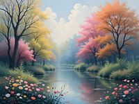 Een adembenemend uitzicht op een rivier waarvan de oevers zijn omzoomd met een kleurrijke overvloed aan bloemen.
