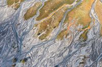 In Zwitserland een bijna droge rivierbedding waar je de kleine waterstroompjes nog ziet lopen tussen de kiezels en het grind in. Deze rivier zal na de winter weer vol met water staan en dan weer een heel ander beeld geven. Nu een heel abstract beeld met al die vormen.