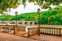 Terras aan de rivier de Dordogne met op de achtergrond een prachtige middeleeuwse brug over de rivier de Dordogne in Frankrijk.