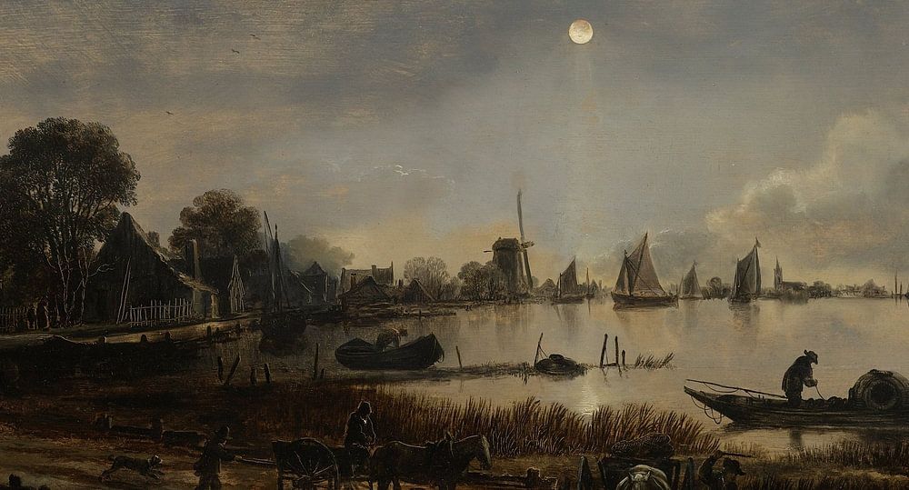 Van der Neer was een schilder met twee specialiteiten: winterse taferelen en nachtelijke, maanbeschenen landschappen. Met slechts enkele kleuren verf wist Van der Neer hier de volmaakte illusie van een maannacht te scheppen. Het kille schijnsel weerspiegelt in het water, ketst op de ruitjes van de huizen links en doet de witte veertjes van de eenden op de voorgrond oplichten.