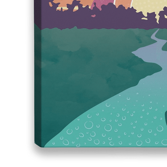Minimalistisch-abstract landschap met een rivier en een bos in de verte bij zonsopkomst. De zon heeft iconische retro-style zonnestralen en is versierd met grafische elementen, net als de rivier. De kleuren zijn varianten van geel, orange, paars en turquoise plus wit.