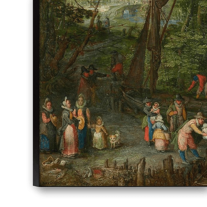 Brueghel voerde dit prachtige kleinschalige werk uit dat een uitgestrekt rivierlandschap verbeeldt in 1607, toen hij op het hoogtepunt van zijn kunstenaarschap was. Zijn beeld richt zich op het dagelijks leven in de buurt van een brede rivier en een kleinere zijrivier, die door een klein dorp stroomt. Zachte lichtbaden, maar ook veranderingen in de kleurtonaliteiten van de bomen en het water - van okers en bruinen op de voorgrond, tot groen in het midden, tot blauw in de verte - vergemakkelijken de overgang naar de diepte. Hoewel het tafereel fantasierijk is, moet het het leven langs de Schelde, de belangrijkste rivier die door het laaggelegen Vlaamse platteland stroomt, weerspiegelen. De grote kerk die de verre stad aan de horizon domineert, is herkenbaar als de Sint Michaelis, de Antwerpse kathedraal.