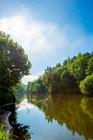 De haas bij Meppen op een mooie ochtend in de zomer. Aan de oevers van de Hase zijn er dichte bossen in het licht van de felle zon.