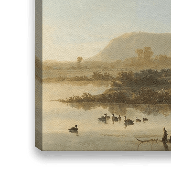 Koop Rivierlandschap met ruiters, Aelbert Cuyp als reproductie op canvas, aluminium dibond, (ingelijste) fotoprint, behang en ArtFrame, op maat geprint in Fine-Art kwaliteit.