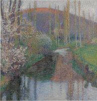 Een rivier kabbelt door een landschap en weerspiegelt de bomen en berg op de achtergrond van het schilderij.