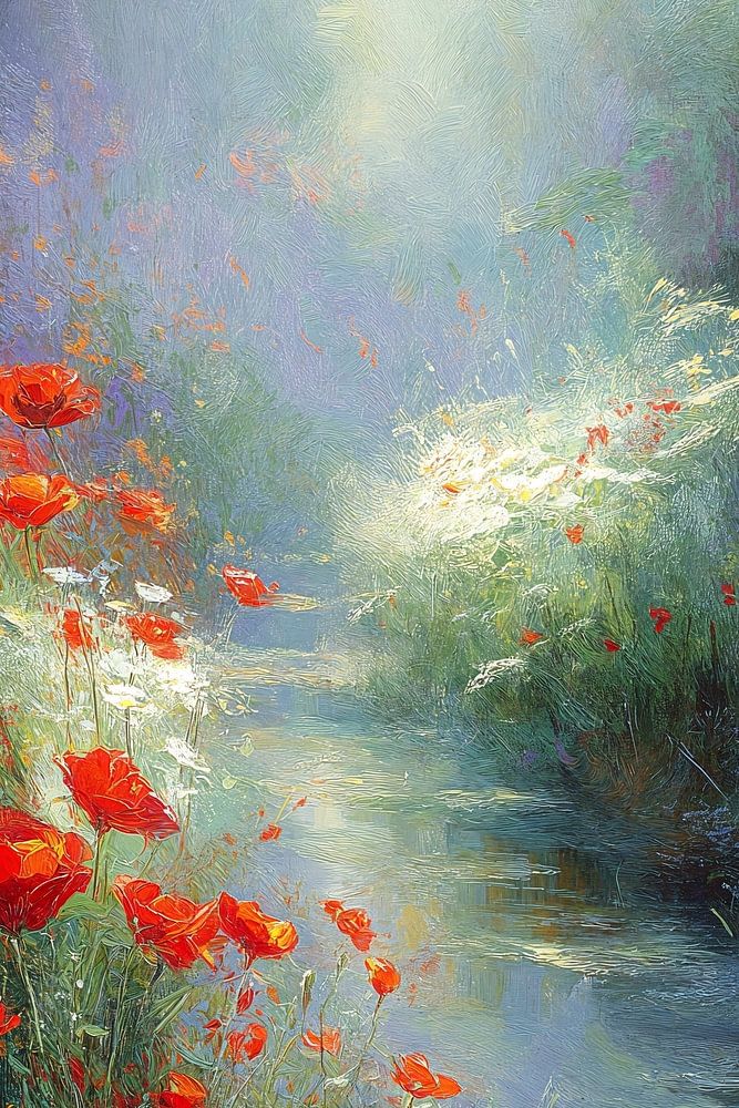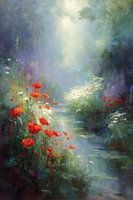 Een betoverend impressionistisch tafereel waar vuurrode klaprozen zich langs een mistige beek ontvouwen. Het spel tussen licht en schaduw creëert een dromerige sfeer, waarbij de warme rode tinten prachtig contrasteren met de koele, nevelige blauwtinten van de omgeving. Witte veldbloemen dansen tussen het groen, terwijl een zachte gloed door de bomen breekt en het water doet glinsteren.