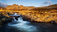 Een kleine rivier kronkelt vanuit de bergen naar beneden en mondt uit in de aangrenzende Varangerfjord. Het berglandschap baadt in het gouden licht van de middernachtzon.