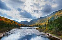Staande op een brug in Nationaal Park Jacques-Cartier, Canada, omarm je een verbluffend uitzicht dat de essentie van de herfst vangt in al haar glorie. Voor je strekt zich een schilderachtig tafereel uit, waar een rustige rivier zich een weg baant door een betoverend landschap van weelderige bossen gehuld in de warme tinten van het seizoen. De bomen, getooid in een bont kleurenpalet van rood, oranje en geel, weerspiegelen zich zachtjes in het kalme water, waardoor een spiegelend tableau van herfstpracht ontstaat.