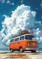 Stap terug in de tijd met dit charmante retro Kombi-busje, perfect geparkeerd op een zandstrand. De iconische oranje kleur steekt af tegen de diepblauwe lucht en pluizige witte wolken en roept een nostalgisch gevoel op van bohemienachtige zwerflust en zorgeloze zomervibes.