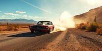 Een vintage rode Mustang scheurt over de asfaltweg van een woestijnlandschap, stofwolken achter zich latend.