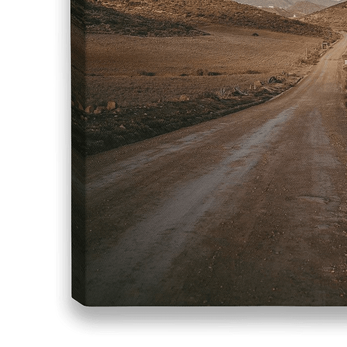 Verticale fotoprint van het landschap in Zuid Spanje met de onverharde weg tussen de bergen in Zuid Spanje Andalusie. Het is de weg van Almeria naar het Monsul. Voor een heerlijk vrij en ruimtelijk gevoel.