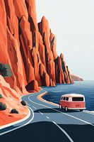 Een stijlvolle retro-moderne illustratie van een iconisch rood-wit Volkswagen busje dat langs een dramatische kustweg rijdt. De imposante oranje kliffen contrasteren prachtig met het diepblauwe water, terwijl de slingerende weg het gevoel van avontuur en vrijheid benadrukt. De minimalistische stijl en het warme kleurenpalet creëren een tijdloos gevoel van escapisme en zomerse nostalgie.