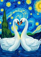 Het schilderij toont twee witte zwanen met hun nekken in elkaar verstrengeld, die een hartvorm vormen tegen een levendige blauwe nachtelijke hemel. De achtergrond is een wervelende sterrennacht die doet denken aan Vincent van Gogh's beroemde 'Sterrennacht' schilderij, met gele sterren en wervelende wolken. De zwanen bevinden zich in een waterlichaam, met rimpelingen die het licht van de sterren weerspiegelen.