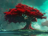 Een machtige bonsaiboom troont tegen een mystieke, mistige achtergrond die schommelt tussen azuurblauwe en smaragdgroene tinten. Zijn robijnrode bladeren stralen en worden weerspiegeld in het kalme water, waardoor een sfeer van diepe rust en reflectie ontstaat. De sterke stam en de brede takken van de boom getuigen van zijn duurzaamheid en waardigheid, terwijl het omringende landschap en de zachtjes vliegende vogels de harmonie van het tafereel compleet maken. Dit schilderij is een eerbetoon aan de schoonheid van de natuur en de stilte die ons uitnodigt om stil te staan en na te denken.