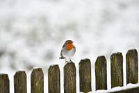 Een roodborstje zit op het hek terwijl het sneeuwt.