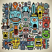 Een kleurrijke en ingewikkelde doodle kunst van verschillende robotgezichten en objecten.