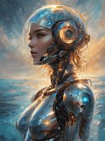 Dit is een portret van een robotica vrouw. Ze is gemaakt van metaal en uitgerust met kunstmatige intelligentie. Ze is een technologische evolutie. Hoe gaat de toekomst als de technologie zich blijft ontwikkelen?