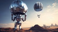 Deze afbeelding toont een buitenaards landschap in tinten van bruin en blauw, waarin enkele glimmende robots zich bevinden. Het lijkt alsof deze robots de enige bewoners van deze vreemde planeet zijn en ze zijn volledig op hun taak gefocust. Hun glanzende metalen oppervlakken reflecteren het licht van de planeet en doen denken aan een futuristische esthetiek. Je kunt je afvragen wat deze robots hier precies doen en waarom ze zo belangrijk zijn voor deze planeet? De afbeelding nodigt uit tot verbeelding en fantasie en doet ons nadenken over wat er allemaal mogelijk is in het onbekende universum.
