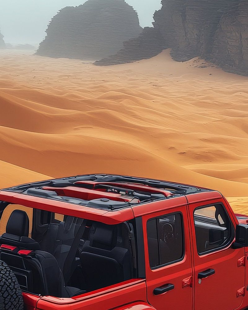 Een opvallende rode Jeep Wrangler snijdt door goudkleurig woestijnzand tegen torenhoge zandstenen kliffen en een dramatische lucht. Een eerbetoon aan avontuur, vrijheid en off-road meesterschap.