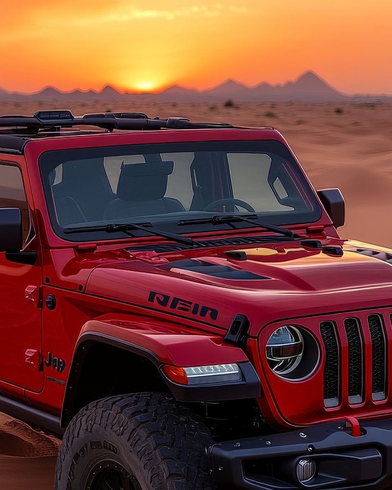 Een opvallende rode Jeep Wrangler snijdt door goudkleurig woestijnzand tegen torenhoge zandstenen kliffen en een dramatische lucht. Een eerbetoon aan avontuur, vrijheid en off-road meesterschap.