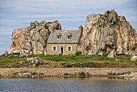 Ein zwischen Felsen stehendes Haus an der Nordkueste der Bretagne