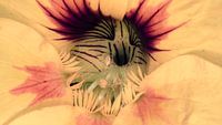 Dit is een macrofoto van de Oost-Indische kers, en als je daar zo met je snuit bovenop ziit zie je ineens een artiest die uithaalt tijdens zijn song. Je ziet twee gesloten ogen met diepe wenkbrauwen erboven, een open mondje met zelfs een microfoontje ervoor. Zo zie ik dat.