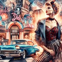 Een vrouw met een vintage stijl poseert prominent op de voorgrond, tegen een kleurrijke achtergrond die de klassieke Americana van de jaren 1950 oproept. Achter haar creëren een klassieke diner met neonreclame, een oldtimer en elementen van stedelijke architectuur een nostalgische scène.