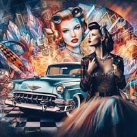 Een afbeelding in retrostijl toont een klassieke blauwe auto op de voorgrond met een stijlvolle vrouw ernaast. Achter hen is een kleurrijke collage met een groot portret van een andere vrouw, levendige abstracte vormen en nostalgische symbolen zoals een vintage microfoon.
