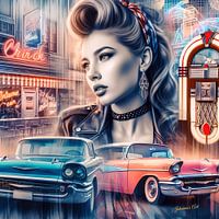 Een gestileerd portret van een vrouw met een retrokapsel en make-up staat prominent voor een achtergrond met klassieke Amerikaanse motieven uit de jaren 1950. Achter haar staat een oldtimer geparkeerd bij een diner dat de sfeer ademt van een vervlogen tijdperk, compleet met neonlichten en een jukebox.