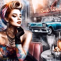 Een stijlvolle vrouw met retro haar en tatoeages zit aan de toonbank van een restaurant, met een klassieke blauwe auto uit de jaren 50 en de woorden "Rock & Roll" in een neonlicht achter haar. De scène roept een nostalgische Americana vibe op, compleet met milkshake, suikerklontjes en stadsgebouwen op de achtergrond.