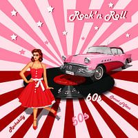 Pin-up girl in rockabilly kleding, met een record en vintage retro-stijl van de jaren '50 in het roze.