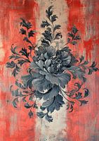 Details: bloemenschilderij, moderne kunst, Rococo stijl, rood, grijs, bloem, kunstwerk, grijze bloem, rode achtergrond, textuur