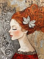 Rococo Vrouw met Bloem - Dit vrouwen schilderij toont een elegante dame met rood haar en een zilveren bloemaccessoire, tegen een achtergrond van gouden en zilveren Rococo-achtige patronen op een canvas met tastbare texturen van crackers en pasteuze verf.