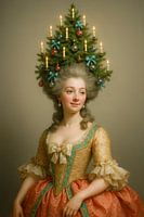 Dit betoverende kunstwerk toont een vrouw in rococo geïnspireerde kleding die een indrukwekkende kerstboom draagt als onderdeel van haar kapsel. De kleine kaarsjes bovenop de takken geven een warme gloed die het zachte licht op haar gezicht versterkt. De blauwe strikjes en glanzende kerstballen voegen een feestelijke speelsheid toe.…