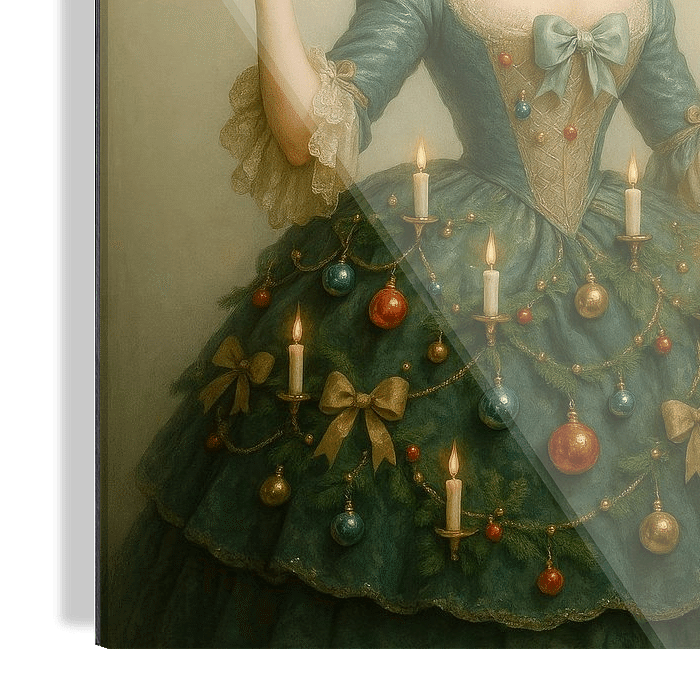 In dit werk zie je een elegante dame die is uitgebeeld in een rijke rococo stijl. Haar jurk is versierd met kerstballen, strikken en kleine takjes die zacht langs de stof vallen. Op haar brede rok branden kleine kaarsen die een warme gloed verspreiden. Haar kapsel is hoog opgestoken en eveneens gedecoreerd met lichtjes en ornamenten…