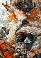 Details: moderne Rococo, vrouw, vlinder, herfstkleuren, elegantie, hoed, bloemen, schilderij, kunst,…