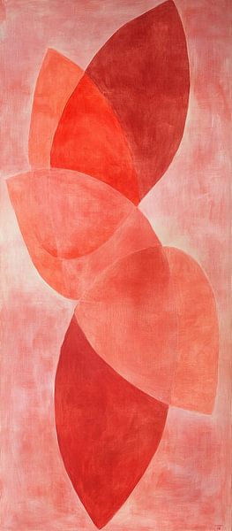 Rode Abstractie | Rode Diepte - Dit abstracte schilderij kenmerkt zich door grote, overlappende vormen in verschillende tinten rood tegen een zachtere roze achtergrond die een gevoel van diepte en beweging creëert.