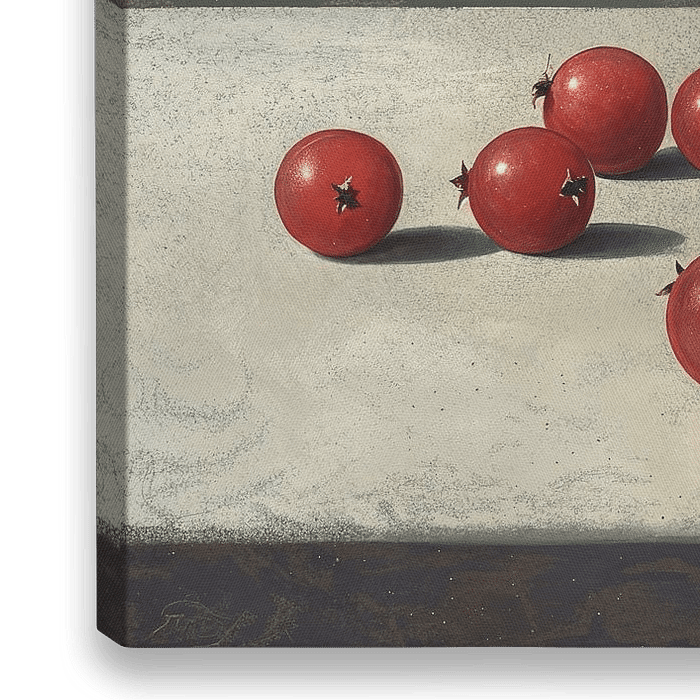 Rode Bessen | Reflective Red Berry Repose - Dit realistische stilleven schilderij toont een groep rijpe, glanzende rode bessen met een frisgroene bladertak op een lichtgrijze ondergrond, tegen een diepgroene achtergrond met subtiele textuur.