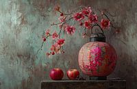 Dit stilleven met rode bloemen en een Oosterse lantaarn in warme tinten van rood, roze, koraal en zacht turquoise voelt elegant en verfijnd aan. Het straalt rust en harmonie uit en brengt mooie oosterse charme in je interieur. Mooi passend in Oosterse, Wabi-Sabi, Romantische en Eclectische woonstijlen en een bijzondere toevoeging voor woonkamer, eetkamer, hal of werkkamer.