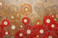 Dit werk toont een veld van felrode bloemen met witte centra, die zich aftekenen tegen een achtergrond van neutrale tinten. Boven de rode bloemen zijn gedetailleerde cirkelvormige patronen in warme aardetinten te zien, die diepte en textuur toevoegen. De combinatie van de levendige bloemen en de subtiele achtergrond creëert een dynamisch en evenwichtig geheel.