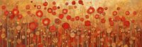 Dit werk toont een overvloed aan rode bloemen tegen een warme, aardse achtergrond. De bloemen, in verschillende tinten rood, lijken bijna te zweven boven de grond. De achtergrond varieert van diepe oker- en bruintinten tot lichtere, gouden tonen, wat een gevoel van warmte en rust uitstraalt. De abstracte vormen van de bloemen geven het werk een moderne uitstraling, terwijl de warme kleuren een gevoel van nostalgie oproepen. Dit werk is ideaal voor een woonkamer of slaapkamer, waar het een vleugje natuur en sereniteit kan toevoegen.