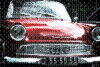 een rode DKW in Popart stijl, zo uit een stipboek weg gereden of door de tijd vergeten en in een droom terug gekeerd.