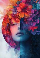 "Rode Dageraad en Blauwe Schemering" is een fascinerend schilderij dat de dualiteit en de balans tussen twee werelden perfect vastlegt. Het portretteert een vrouw wiens gezicht is verdeeld in twee vlakken, elk met een eigen kleurenpalet en sfeer.
