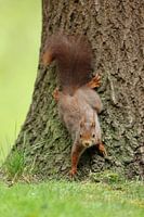 Een portret van een Rode Eekhoorn aan de voet van een boom. Deze pluizige bosbewoners zijn snel, intelligent en behendig.