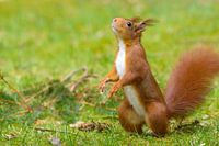 Deze Eekhoorn ging op zijn achterpoten staan omdat hij wat lekkers rook boven 'm.