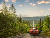 De fotobewerking "Rode Fjätvallen" brengt een prachtige combinatie van nostalgie en natuur samen. Op de foto zien we een klassieke rode Engelse auto die door de uitgestrekte bossen van Zweden rijdt op een eindeloos lange rechte weg.